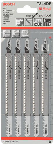 Пилки для лобзика Bosch 2608634243 поставляются комплектом из 5 биметаллических пильных полотен, которые оснащены хвостовиками типа EU (T-образными) для присоединения к патрону электролобзика. Пилки имеют длину рабочей части 126 мм и полную длину 152 мм, являясь оптимальной оснасткой для пиления цельной древесины, фанеры или ДВП толщиной от 5 до 100 мм. Подходящие для ведения быстрого и прямого реза в толстом материале полотна имеют шаг зубьев 4 мм.