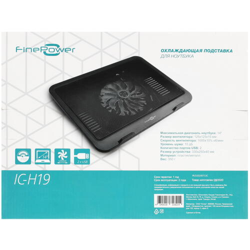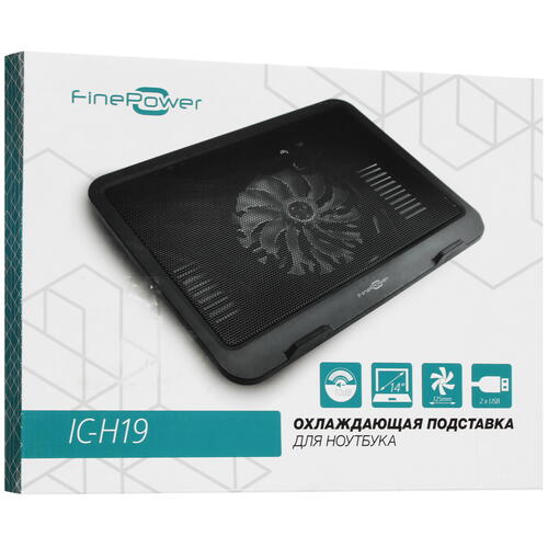 FinePower IC-H19 использует в работе один вентилятор, размеры которого равны 130x130x15 мм. Разгон скорости этого компонента до 900-1100 об/мин говорит об эффективности охлаждения. Таким образом, вся система ноутбука, все его «внутренности» защищены от перегрева. Дополнительно модель оборудована двумя USB-портами.