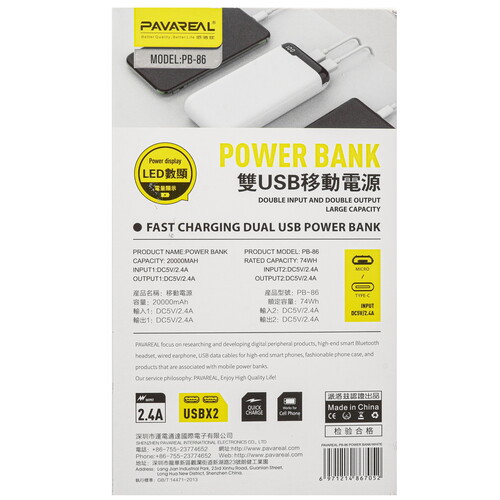 Портативный аккумулятор PAVAREAL PB-86 черный