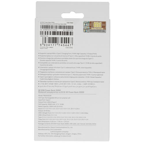 Портативный аккумулятор Xiaomi Mi 50W Power Bank 20000 станет незаменимым помощником в дороге или на учебе. Модель емкостью 20000 мА*ч обеспечивает быстрый заряд смартфонов, плееров, ноутбуков и других устройств. Выходное напряжение составляет 5, 9, 10, 12, 15 и 20 В, что позволяет безопасно заряжать различные устройства, в том числе маломощные.