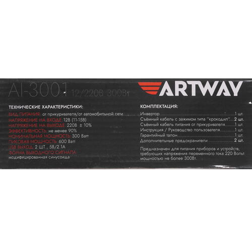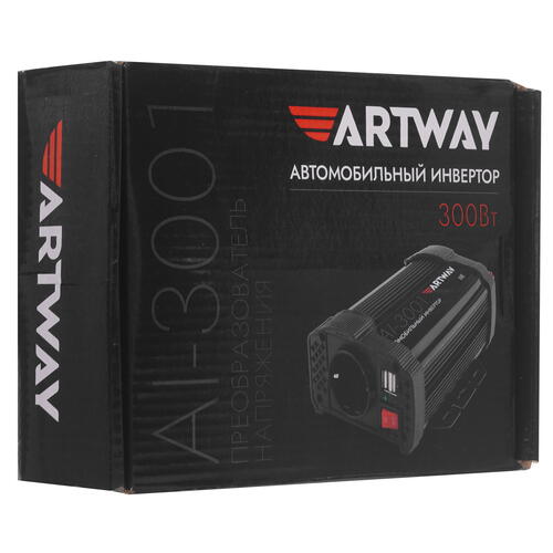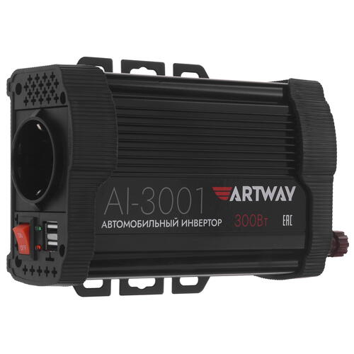 Инвертор Artway AI-3001 позволяет преобразовать входное постоянное напряжение 12В в переменное напряжение 220В, тем самым обеспечивает организацию подключения различных электроприборов в транспортном средстве. В оснащение инвертора входят одна розетка стандарта евро и два порта USB для подзарядки или питания портативных устройств. Благодаря металлическому корпусу Artway AI-3001 устойчив к механическим воздействиям, а вентиляционные отверстия способствуют эффективному отведению тепла и стабильному функционированию устройства.