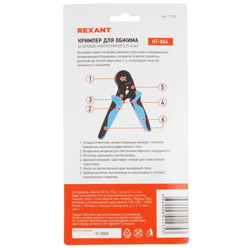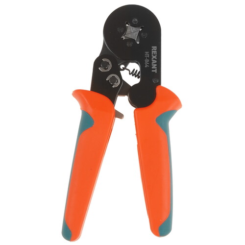 Пресс-клещи REXANT HT-864 оснащены рукоятками из синтетического покрытия с прорезиненными вставками, не допускающими проскальзывание ладоней. Модель предназначена для обжима штыревых наконечников с сечением от 0.25 мм² до 6 мм².