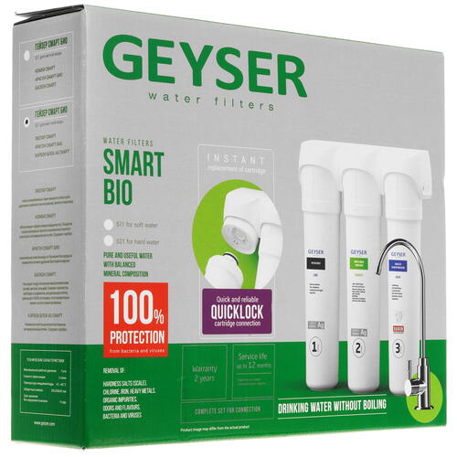 Гейзер Смарт Био 521 удаляет неприятные запахи, выполняет очистку воды от бактерий, хлора, солей жесткости, марганца и тяжелых металлов. Устройство поддерживает работу при давлении в системе 0.5-7 атм с герметичным соединением с помощью резьбы 1/4. Фильтр гарантирует простоту установки и замены износившихся картриджей.