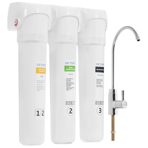 Проточный питьевой фильтр Гейзер Смарт Био 521 выполняет 3 ступени очистки воды. Устройство действует со скоростью 2 л/мин, по истечении ресурса требует замены картриджей. Фильтрующие элементы подходят для перекачивания жидкости с температурой нагрева до 40 °C. Модель дополнена удобным регулятором расхода воды.