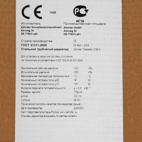 1734 мм, теплоотдача 1151.4 Вт, габариты 276х1792х62 мм, рабочее давление 10 Бар, вес 16 кг