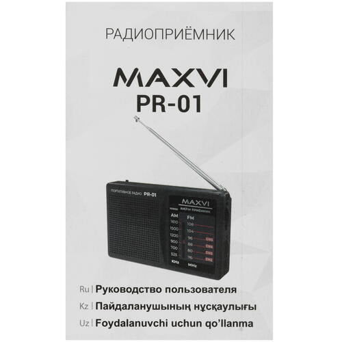 Конструкцией корпуса Maxvi PR-01 предусмотрен ремешок для удобства транспортировки. Выбрать подходящий диапазон позволяют регуляторы, расположенные на боковой стенке устройства. Передача монозвучания осуществляется через один динамик. Конфигурация включает разъем для подключения гарнитуры.