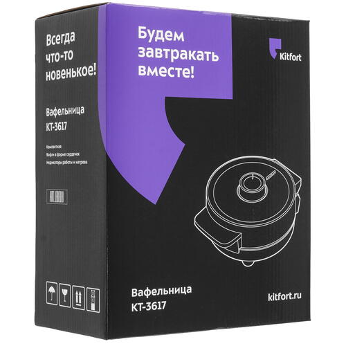 Вафельница Kitfort КТ-3617 выполнена в корпусе из пластика и нержавеющей стали. Благодаря встроенному термостату автоматически поддерживается заданный температурный режим. Нескользящие ножки на основании обеспечивают устойчивое размещение прибора.