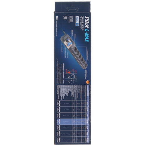 Сетевой фильтр Pilot L-MAX способен обезопасить бытовую и офисную технику. В модели реализованы варисторная защита от грозового разряда и импульсных помех, емкостный фильтр от высокочастотных помех, а также технологии защиты от перегрузки и короткого замыкания. Сетевой фильтр оборудован 5 розетками с заземляющим контактом и 1 розеткой GP с 6 отверстиями для подключения приборов с вилкой старого образца. Общий выключатель позволяет одним нажатием включать и отключать питание на всех розетках. Pilot L-MAX поставляется с кабелем длиной 1.8 м.