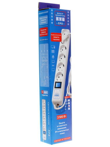 Сетевой фильтр Power Cube Pro подойдет для подключения компьютеров, принтеров, мониторов и другой сложной техники. Одновременно от него получится запитать до шести приборов. Вилки и розетки типа F (евро), провод длиной 3 м (можно использовать в качестве удлинителя). Есть защита от замыкания, ВЧ и импульсных помех.
