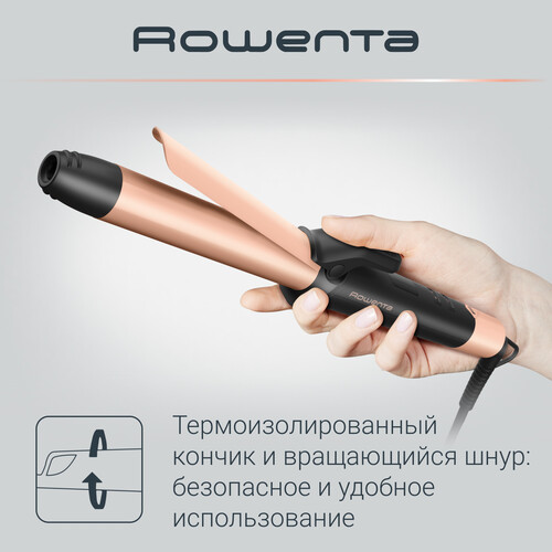 ROWENTA CF2810F0 имеет дисплей для отображения заданных параметров. Время нагрева не превышает 45 сек. Исключить риск появления ожогов и удобно придерживать устройство одной рукой во время укладки позволяет термоизолированный наконечник. Защитная технология автоматически выключает модель во избежание перегрева. Сетевой кабель длиной 1.8 м вращается вокруг оси, что предупреждает спутывание. Компактное хранение на держателе в ванной возможно благодаря наличию петли для подвешивания.