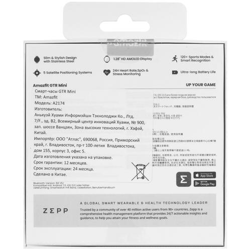 Смарт-часы подключаются к смартфону беспроводным способом по технологии Bluetooth. На экране 1.28 с панелью AMOLED с любого положения отображается яркая и четкая картинка. Встроенные датчики выполняют круглосуточный мониторинг сердечного ритма, уровня кислорода в крови и стресса. Пользователю предлагаются 120 спортивных режимов. В модели реализована поддержка 5 спутниковых систем для точного отслеживания местоположения и построения маршрута. Одного заряда аккумулятора хватает для 720 часов автономности смарт-часов Amazfit GTR Mini.