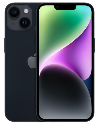 Смартфон Apple iPhone 14 Plus с диагональю экрана 6.7 дюймов представлен в черном цвете и имеет объем внутренней памяти в 128 гигабайт. Защищен от пыли и влаги по стандарту IP68. На задней части смартфона расположены две камеры, по 12 мегапикселей каждая.