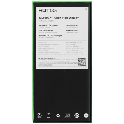 Смартфон Infinix HOT 50i облачен в серый пластиковый корпус с 6.7-дюймовым экраном с защитным покрытием Panda Glass. Работает устройство с 2 сим-картами одновременно, поддерживая связь в диапазоне 2-4G. Объем встроенной памяти устройства составляет 128 ГБ. Разрешение основной камеры достигает 48 Мп, что указывает на возможность делать детализированное фото. Звук устройство транслирует через стереодинамики. К особенностям Infinix HOT 50i относится наличие специального режима для работы в перчатках.