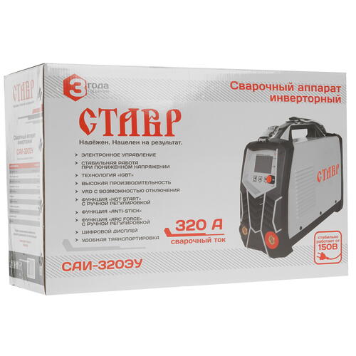 Сварочный аппарат Ставр САИ-320ЭУ позволяет выполнять качественную дуговую сварку с помощью покрытых электродов диаметром 1.6-6 мм. Он предназначен для работы в сети 220 В, обладает сварочным током с регулировкой в диапазоне 20-320 А и характеризуется потребляемой мощностью 6.5 кВт. На панели управления расположены поворотный регулятор, кнопки и дисплей. Функции антиприлипания, горячего старта и форсажа дуги обеспечивают удобство при выполнении работ. Ручка и ремень позволяют легко перемещать оборудование. А комплексная система защиты гарантирует высокую безопасность в эксплуатации Ставр САИ-320ЭУ.