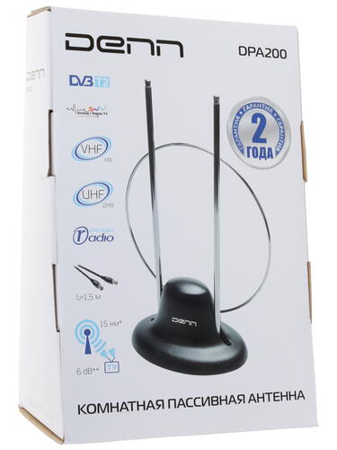 ТВ-Антенна Denn DPA200 – компактное приспособление, предназначенное для установки внутри помещения. Устройство отличается стабильностью сигнала: даже при осложнениях в приеме сигнала на экране будет гарантировано транслироваться чистая картинка. Модель создана для применения вместе с приставками DVB-T2.