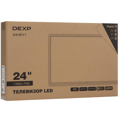 Матрица VA передает изображение в разрешении 1366x768, что соответствует HD-качеству. Благодаря частоте обновления 60 Гц и времени отклика 9.5 мс картинка на экране не будет размытой. Экран с углами обзора 178°/178° сохраняет четкость цветопередачи вне зависимости от ракурса просмотра. В телевизоре DEXP 24HEY1 есть Wi-Fi и Smart TV. Система YaOS позволяет использовать голосовой помощник Алиса, предлагает список рекомендаций по интересам пользователя, ищет контент во всех источниках. На тыльной стороне корпуса расположены два USB-порта и три HDMI-разъема для подключения мобильных и видеоустройств.