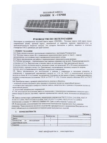 Tropik Line К3 имеет несколько ступеней мощности (от 1500 до 3000 Вт). Устройство подключается к сети 220 В с помощью штепсельной вилки. В качестве нагревательного элемента в этой модели используется СТИТЧ. Представленная тепловая завеса монтируется горизонтально на высоте не более 1.5 м. Габариты устройства составляют 45.2х14.5х11.4 см.