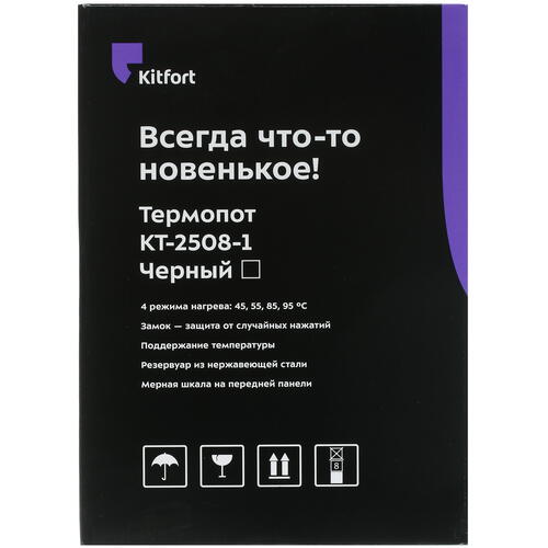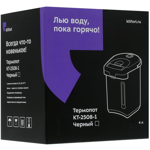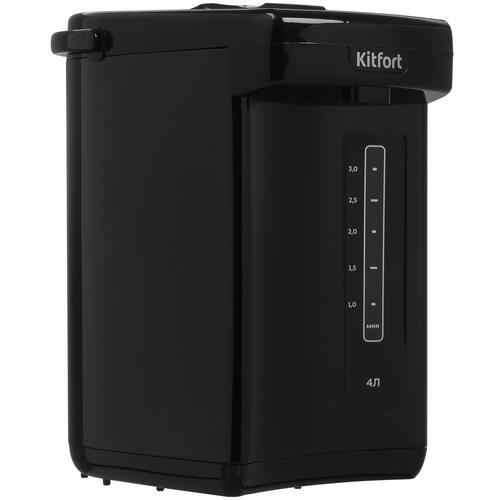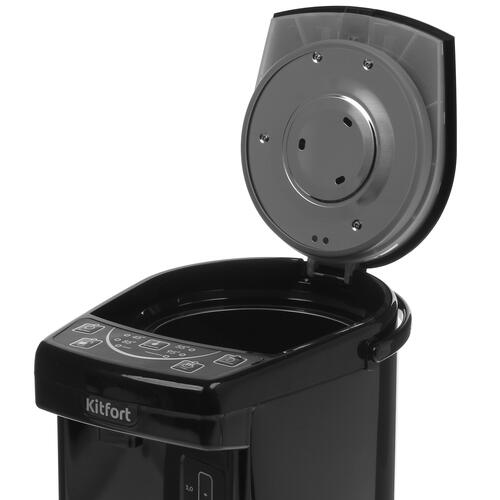 Корпус Термопота Kitfort KT-2508-1 дополнен ручкой для удобной переноски. Фильтр поглощает посторонние примеси. Колба из нержавеющей стали препятствует быстрому остыванию жидкости. Мерная шкала поможет узнать остаток содержимого в 4-литровом резервуаре. Электрический насос обеспечивает подачу необходимого объема воды.