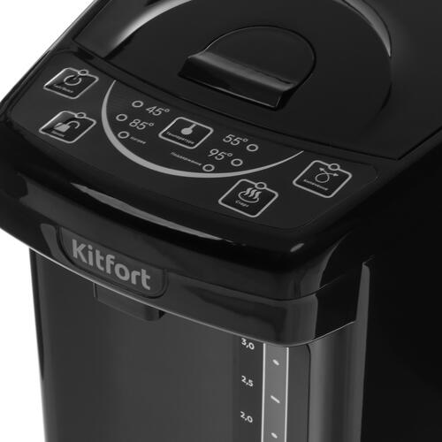 Термопот Kitfort KT-2508-1 предлагает возможность выбора подходящего среди 5 температурных режимов. Доступ к функционалу осуществляется через кнопочную панель. Система блокировки исключит риск образования ожогов от пара. Индикаторы проинформируют об установленных параметрах.