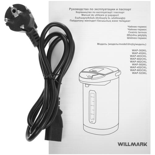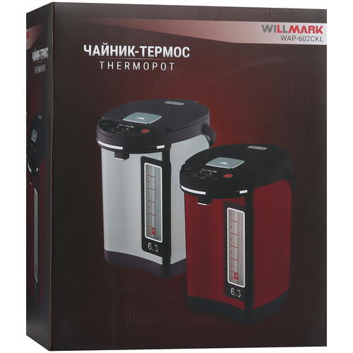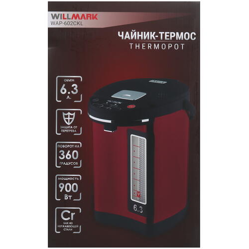 WILLMARK WAP-602CKL работает в одном температурном режиме кипячения воды до 100 °C. Подсветка корпуса выполняет функцию индикации включения. Отметки литража на емкости не дают налить воду больше положенного количества для безопасной работы устройства. Термопот дополнен системой защитного отключения при перегреве.