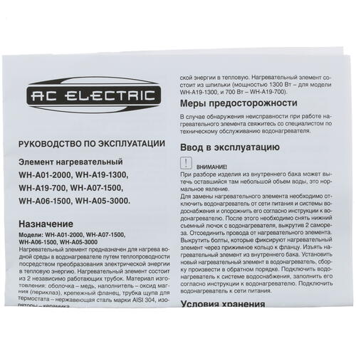 Элемент нагревательный AC Electric WH-A5-3000 является надежным расходным материалом, совместимым с водонагревательными баками различных производителей. Благодаря мощности 3000 Вт обеспечивается высокая эффективность нагрева воды. Данный компонент помогает восстановить работоспособность нагревателя в случае износа оригинального нагревательного элемента. Изготовленный из качественных материалов с использованием меди, элемент AC Electric WH-A5-3000 отличается стойкостью к появлению коррозии и длительным эксплуатационным ресурсом.