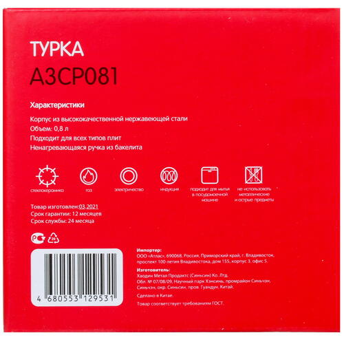 Турка Aceline A3CP081 с прочным и легким корпусом из нержавеющей стали легко очищается от загрязнений. Утолщенное дно гарантирует быстрое и равномерное распределение тепла, что важно для правильного приготовления бодрящего напитка. Турка подходит для работы с любыми плитами, в том числе индукционными.