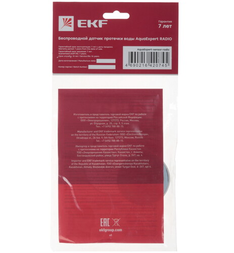 Беспроводной датчик протечки воды AquaExpert RADIO EKF PROxima предназначен для обнаружения протечек воды в системах водоснабжения, отопления, канализации и кондиционирования. Датчики протечки воды устанавливаются в местах вероятного появления воды при авариях и протечках: на кухне, в ванных комнатах, санузлах, под стиральными машинами, под батареями отопления и т.п.