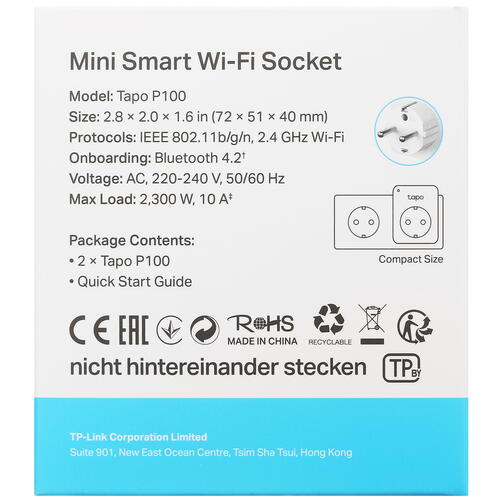Для оптимальной работы умная розетка TP-Link Tapo P100(2-pack) требует наличие Wi-Fi 2.4 ГГц с активным доступом в Интернет. Набор из 2 устройств подходит для питания от сети 220-240 В, выдерживает нагрузку по 2.3 кВт при токе 10 А. Это позволяет подключать многие бытовые приборы и устройства, не опасаясь перегрузок.