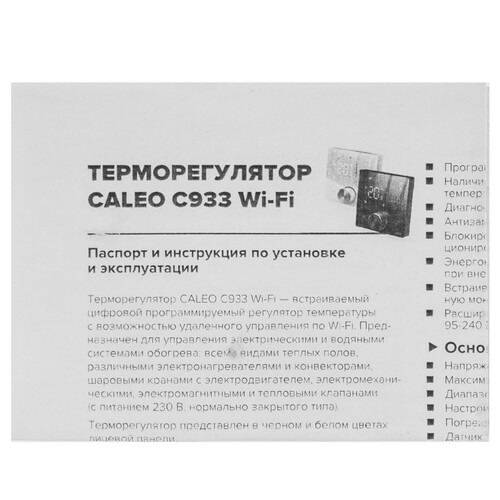 Терморегулятор CALEO C933 WI-FI — это встраиваемый цифровой программируемый регулятор температуры, предназначен для управления электрическими и водяными системами обогрева: всеми видами теплых полов, различными электронагревателями и конвекторами, шаровыми кранами с электродвигателем, электромеханическими, электромагнитными и тепловыми клапанами (с питанием 230 В, нормально закрытого типа).