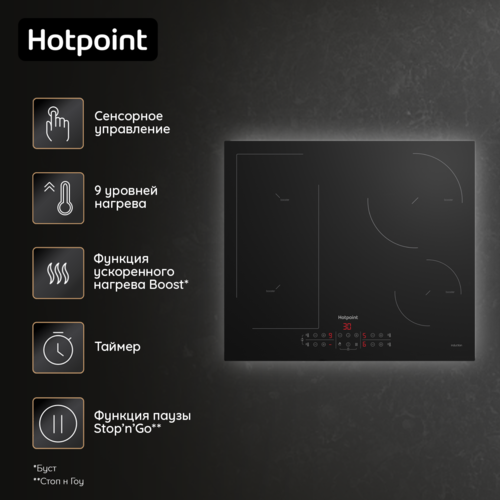 Индукционная варочная поверхность HotPoint HB 1560B NE состоит из 4 разноразмерных конфорок с экспресс-нагреванием на стеклокерамической панели. Это позволяет устанавливать на нее посуду любого диаметра от 10 см, и сразу же приступать к готовке. Для безопасности использования прибора служит блокировка работы и защитное отключение. При необходимости отойти во время готовки можно воспользоваться опцией «пауза». В отличии от электрических моделей, если на индукционную панель HotPoint HB 1560B NE сплывает суп, он не прикипает к ней, а значит, поверхность легко очищается. Таймер прибора можно установить как на отключение конфорок, так и на звуковое оповещение.