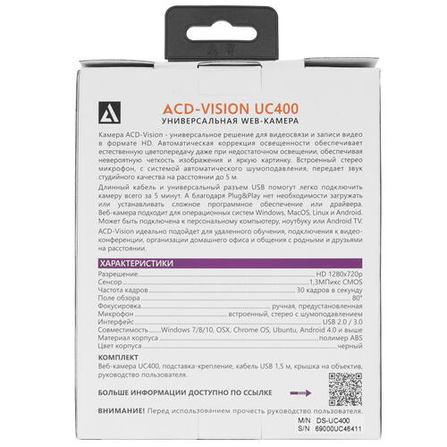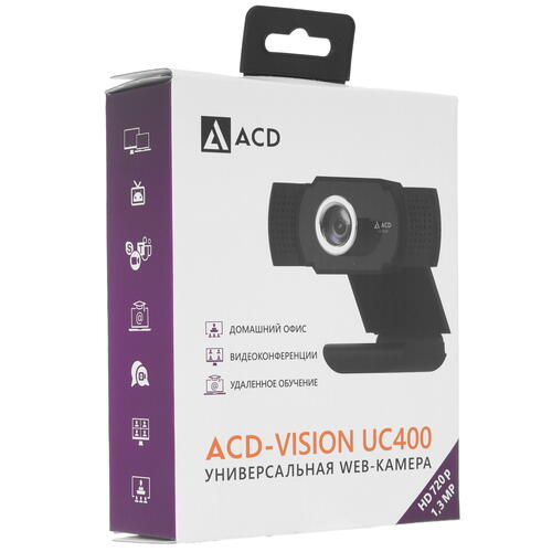 Веб-камера ACD Vision UC400 обеспечивает высокое качество изображения стандарта HD благодаря матрице CMOS 1.3 Мп. Технологии автоматического баланса белого и компенсации недостатка освещенности способствуют формированию насыщенного детализированного изображения в разных условиях. Два интегрированных стереомикрофона с функцией шумоподавления с точностью передают голос. Из конструктивных особенностей веб-камеры ACD Vision UC400 отмечаются защитная шторка и универсальное крепление. Подключение выполняется с помощью разъема USB.