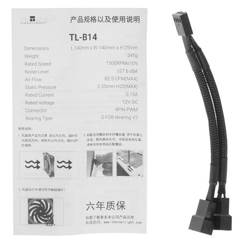 Thermalright TL-B14 - вентилятор диаметром 140 мм, в конструкции которого применяется гидродинамический подшипник (FDB). Скорость вращения вентилятора управляется методом широтно-импульсной модуляции (ШИМ) в диапазоне от 300 до 1500 оборотов в минуту. Поток воздуха достигает 82.5 кубических метров в час, а уровень шума не превышает 27,6 дБА.