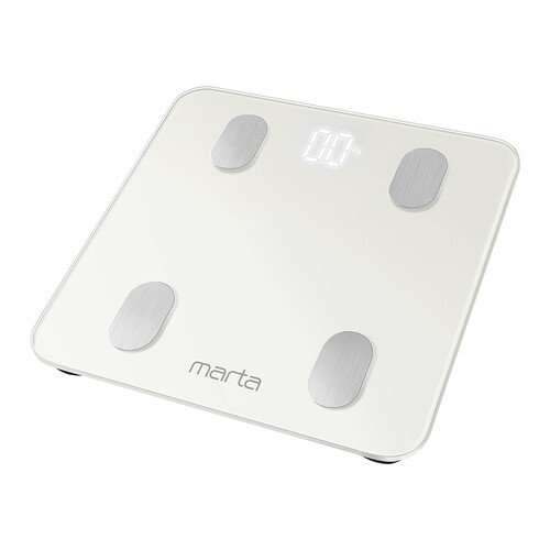 Диагностические напольные весы Marta MT-1606 поддерживают функцию определения состава тела. Модель синего цвета в компактном корпусе с размерами 30x30 см оснащена стеклянной платформой.