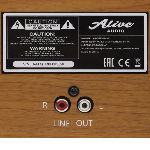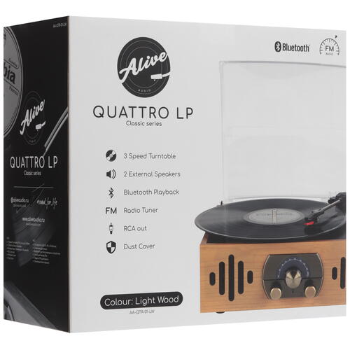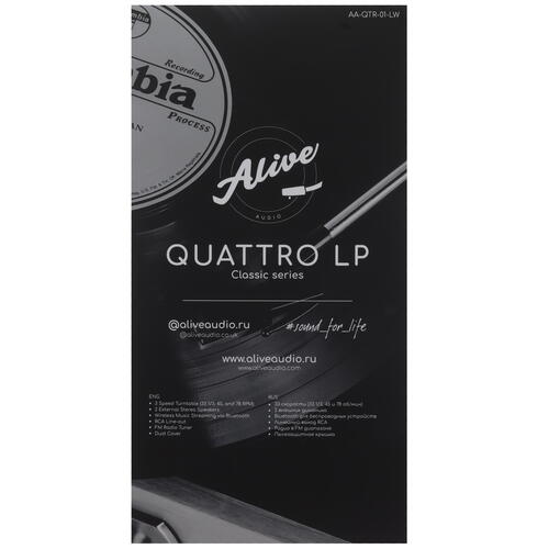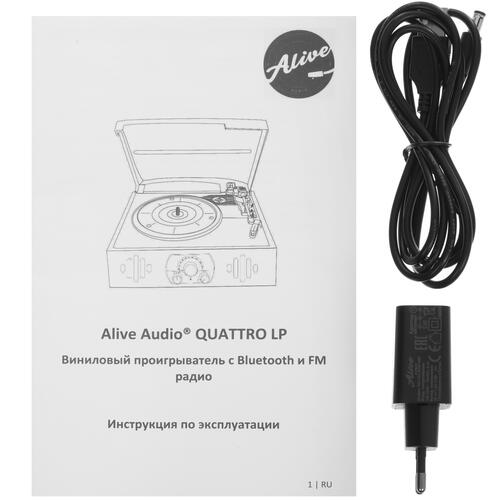 Alive Audio QUATTRO оснащен двумя динамиками по 3 Вт, функцией «автостоп» и FM-тюнером. Для подключения к сторонним устройствам вы можете использовать разъем RCA или модуль Bluetooth. Проигрыватель идет в комплекте с адаптером для переключения скорости вращения пластинки с 33 об/мин на 45 об/мин.
