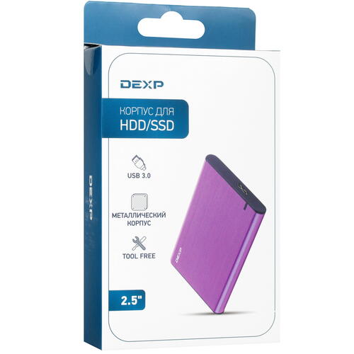 Внешний бокс DEXP HD303 имеет эффектный внешний вид. Цвет корпуса модели – фиолетовый. Вы будете обладать не только эффектным, но и эффективным устройством, позволяющим использовать SATA HDD или SSD в качестве внешних накопителей. Объем установленного накопителя может достигать 8 ТБ. Внешний бокс будет незаменим для пользователей, нуждающихся в возможности физического перемещения большого объема информации.