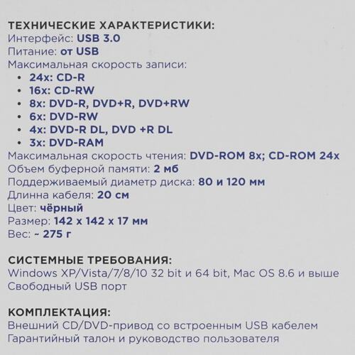 USB 3.2 Gen1, CD 24x/24x/16x, DVD 8x/8x/8x, DL 4x, RAM 3x, черный