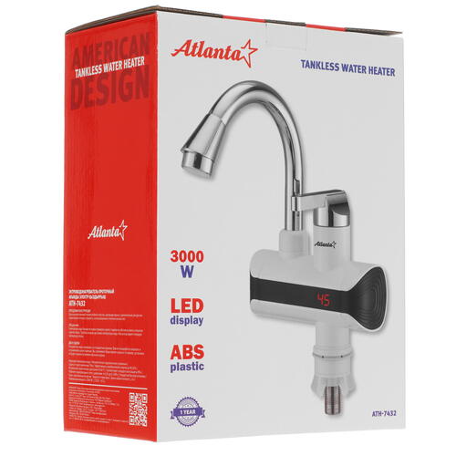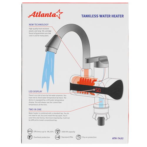 Atlanta ATH-7432 дополнен небольшим дисплеем с индикаторами включения и нагрева, термометром и краном. За безопасность отвечает система защиты от перегрева с блокировкой включения при отсутствии воды. Компактный и мощный водонагреватель отлично подходит для решения повседневных бытовых нужд.