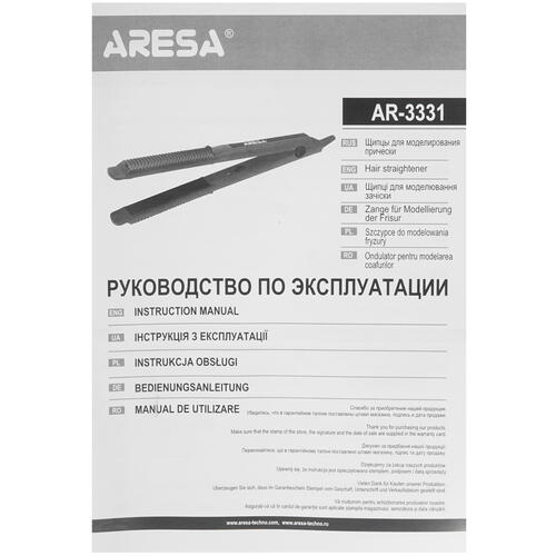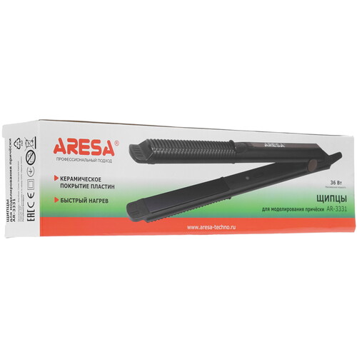 Устройство Aresa AR-3331 действует от стандартной электросети с мощностью 36 Вт и действует в одном режиме. На корпусе имеется небольшой индикатор, указывающий на наличие электропитания. Для нагрева требуется всего 2 минуты. Выпрямитель весит 220 г и обладает размерами 2.7x3x29.5 см.