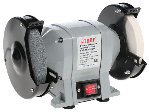 Точило Ставр СЗЭ-150/250 М с двумя параллельными кругами, которые закрыты защитными кожухами и экранами, безопасен для мастера. Асинхронный двигатель достаточно тихий для использования в домашних условиях. Точильный станок подключается в электрическую сеть обычной розеткой, не требующей дополнительных преобразователей.
