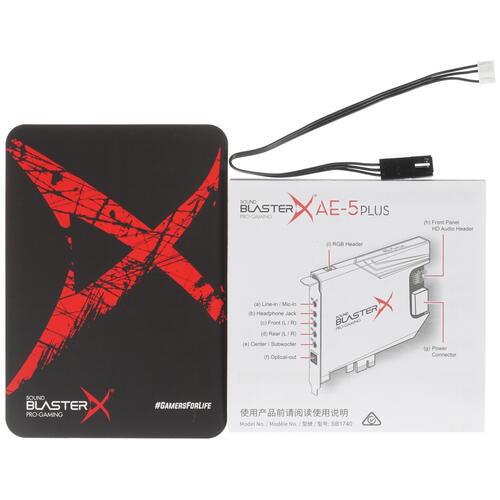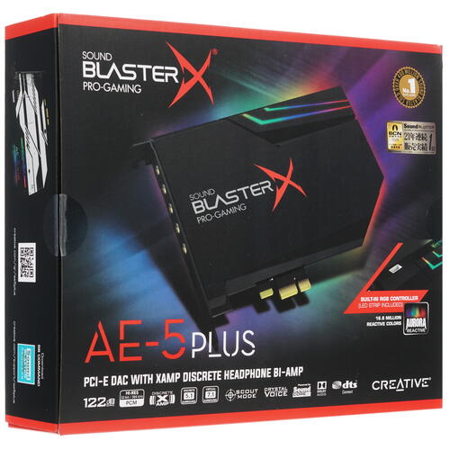 Внутренняя звуковая карта Creative Sound BlasterX AE-5 Plus выполнена в компактном корпусе и использует для установки и подключения интерфейс PCI-E x1. Важной особенностью модели является стильный дизайн, сочетающий в себе строгость линий и форм, а также настраиваемую RGB-подсветку Aurora Reactive. Для подключения на корпусе звуковой карты доступно несколько разъемов jack 3.5 мм, в том числе порт для наушников, а также 1 оптический выход S/PDIF. Комплект поставки включает в себя кабель-удлинитель, а также LED-ленту для дополнительной подсветки.